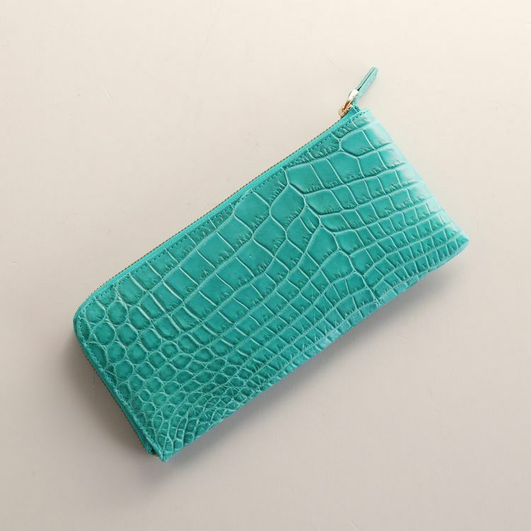『皮革の宝石』と称される ナイルクロコダイルの革を使用しています。 数あるワニ革の中でも 高い人気を誇るエキゾチックレザーです。 表面には上品な雰囲気の マット加工を施しており、 使い込むほどに味わい深くなる 経年変化も楽しめます。 スリムな見ためですが、 紙幣・小銭・カードが 充分に入る収納力です。 外側のL字ファスナーを開けるだけで 財布の中身がすべて見えるので とても使いやすく、 お会計もスムーズに行えます。 内側の一番の特徴は、 ファスナーのない小銭入れ。 ファスナーをなくすことで お財布自体がスリムになり、 お会計にかかる時間も短縮されます。 小銭入れはしっかりと高さがあるので、 L字ファスナーを閉めれば 中身が飛び出す心配もありません。 クロコダイルの高級感を引き立てる、 ゴールドカラーのファスナーを使用しています。 ファスナーチャームにもクロコダイルを使用し、 細部までこだわったデザインになっています。