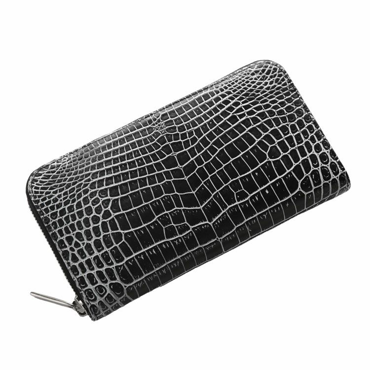 商品名:クロコダイル 長財布 センター取り 一枚革 ラウンドファスナー 日本製 変わり染め JRA メタルファスナー メタリック ブラック ブルー ボルドー ホワイト シルバー