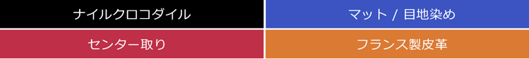 フランスのタンナーの元で鞣されたナイルクロコダイルの腹部の革をセンター取りで使用しています。