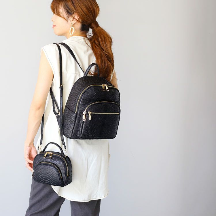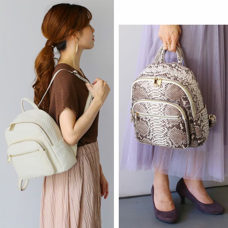 ※キーワード:パイソンバッグ レディースリュック サイドポケット カードポケット 付き 両開きファスナー