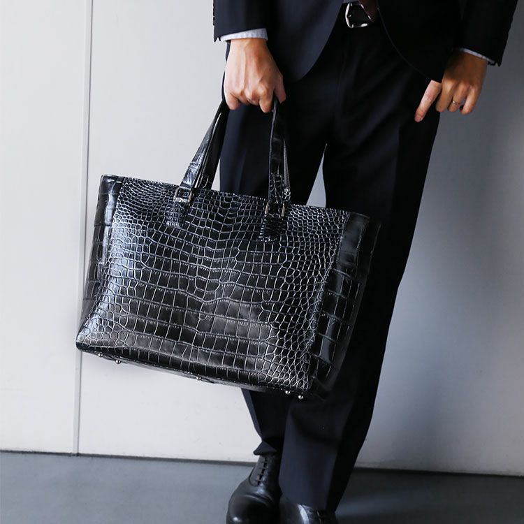 クロコダイル トートバッグ メンズ 日本製 センター取り 幅48cm 肩掛け 自立 ソフト 大きめ 大容量 A4 対応 通勤 オフィス ビジネスバッグ JRA あおりポケット 鰐革 保証書 付き