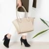 シンプルで使いやすい、大人の女性のためのきれいめトートバッグです。プライベートだけでなく、お仕事バッグとしても最適なサイズ感で汎用性抜群です。底鋲もついているので、床に置く時も汚れの心配がありません。