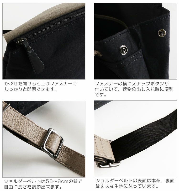 ショルダーベルトは表が牛革、裏がアクリル生地になります。 50-88cmの間で自由に長さの調整が出来ます。 |