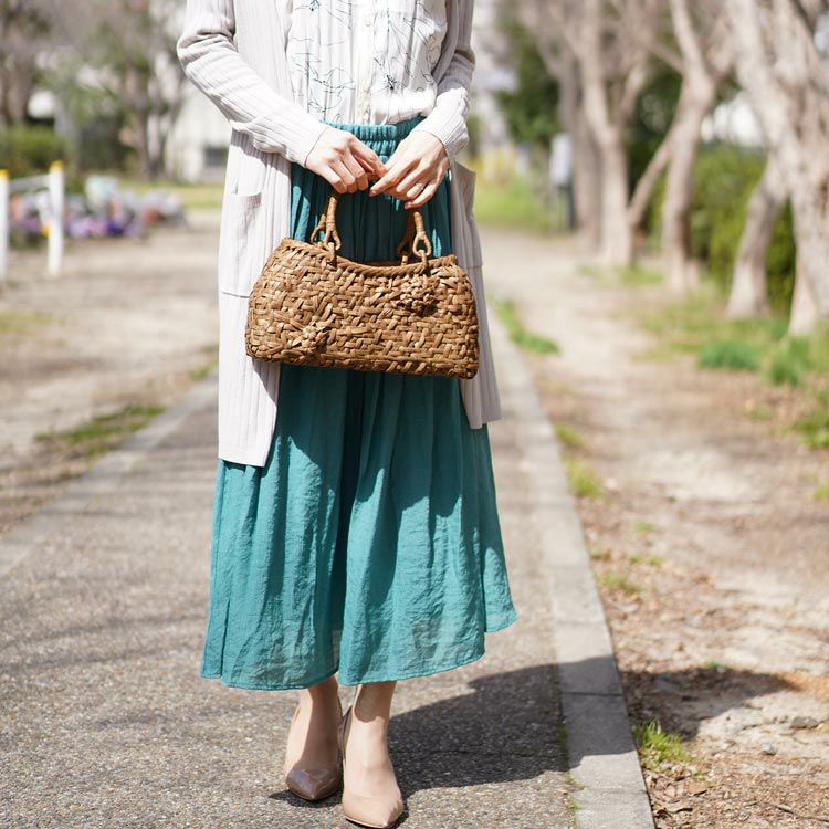 洋装の普段使いにもゆかたや着物など和装にも似合う山葡萄籠バッグです。