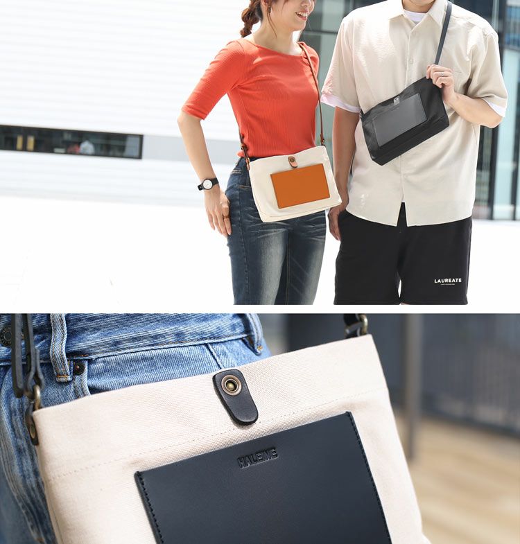 サコッシュ メンズ HALEINE ブランド レザー ブランド キャンバス 生地 ヌメ革 キャンバス地 ショルダーバッグ 横型 革 本革 革サコッシュ 帆布 大きめ マチ付き マチあり ブラック 黒 男 プレゼント ギフト mensbag