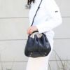 レザーバッグは、統一感がありつつも、巾着部分が目立ち、華やかな印象を与えます。