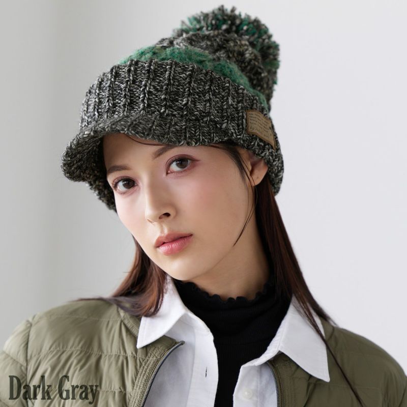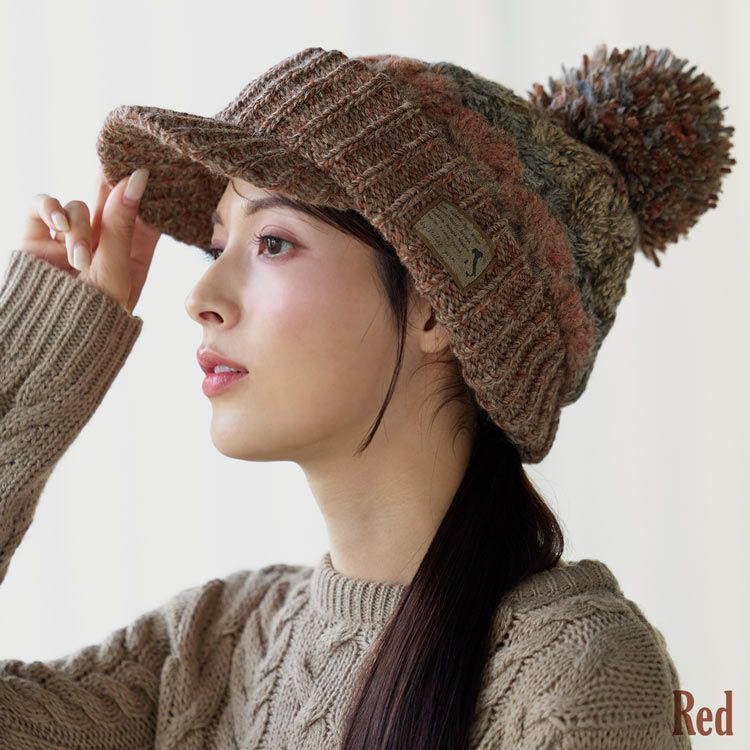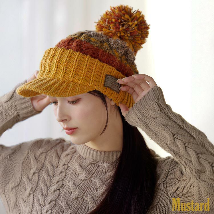 大きめのポンポンがアクセントになった、つば付きデザインのニット帽。