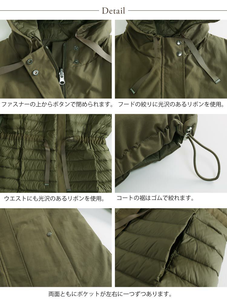 | 素材 | 表側:綿65%、ナイロン35% 裏側:ナイロン100% 詰物(本体):ダウン80%、フェザー20% 詰物(フード部分):ポリエステル100% |