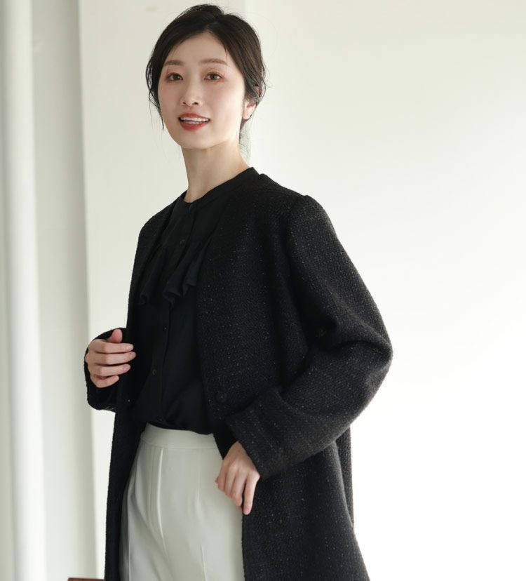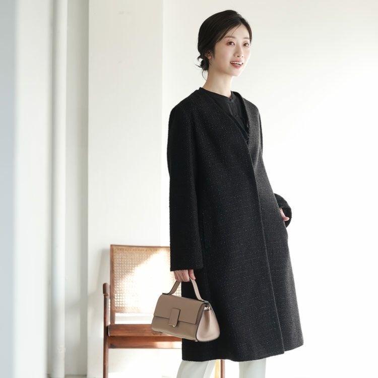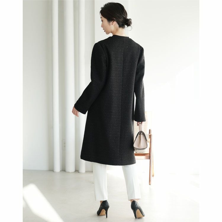 ノーカラー コート レディース Vネック J-white ブラック ラメ ツイード 生地 秋 冬 6F