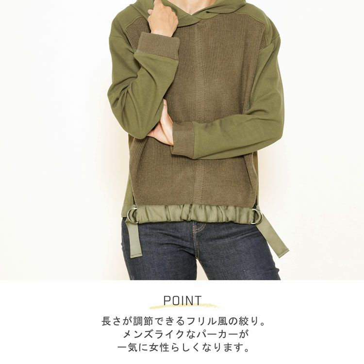 パーカー レディース トップス ニット プルオーバー スウェット M L 切替 異素材 ドッキング コラボ フリル デザイン 春 秋 冬 母 女性 切り替えデザイン かわいい お洒落 プレゼント ギフト