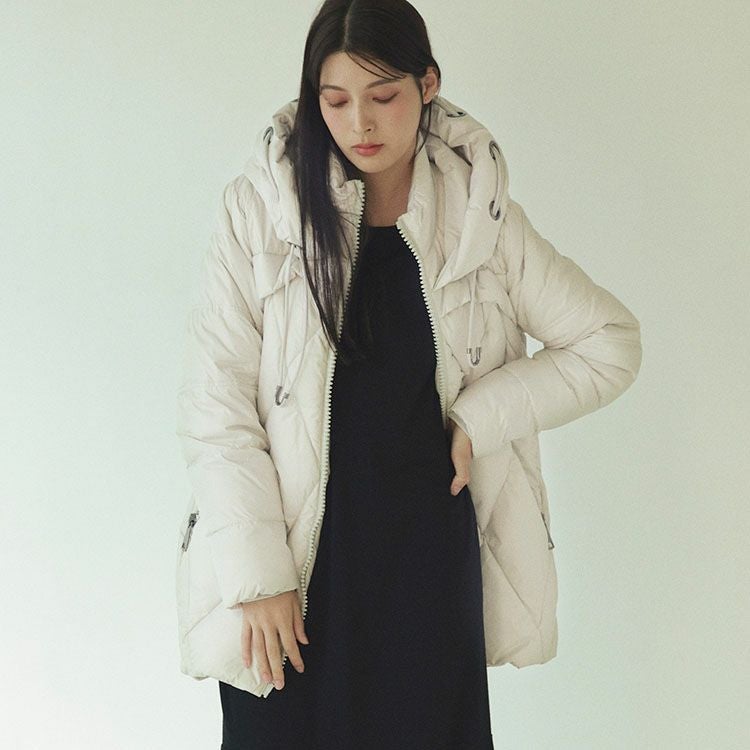 身体全体を丸く包み込むような形のコクーンシルエットのダウンコートです。