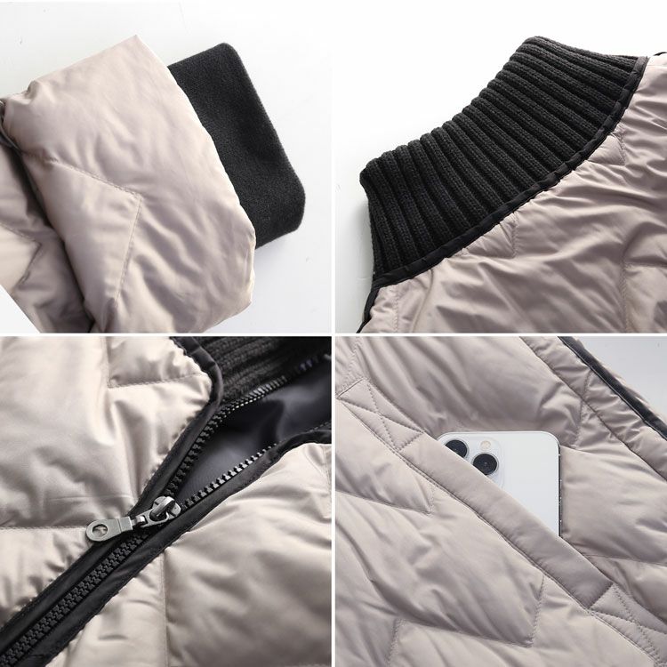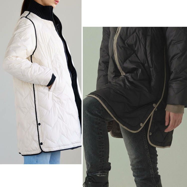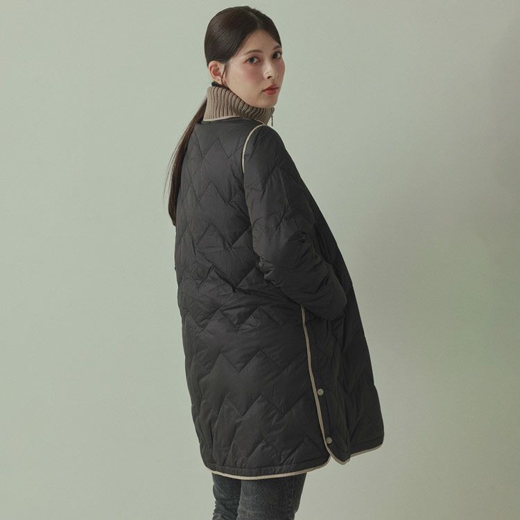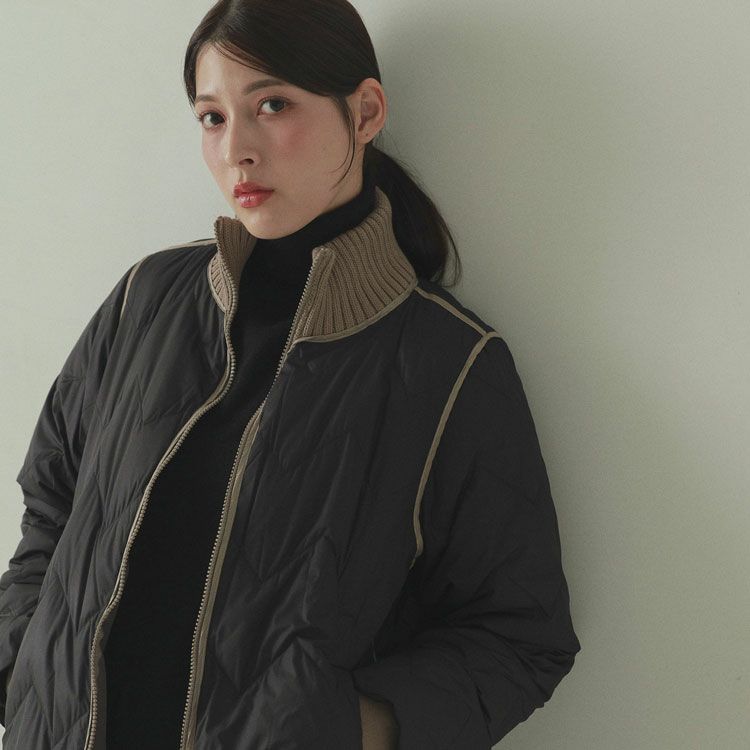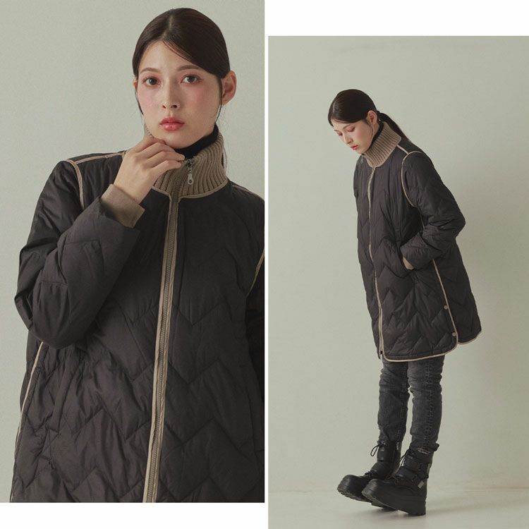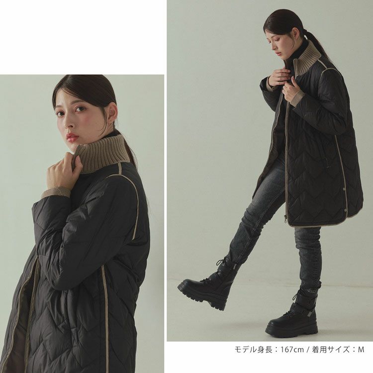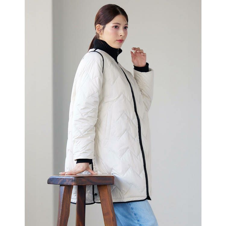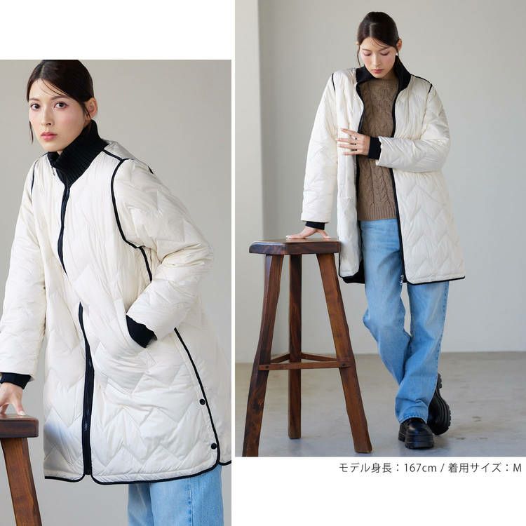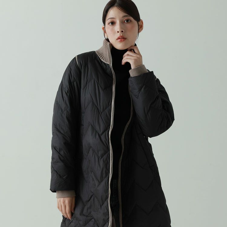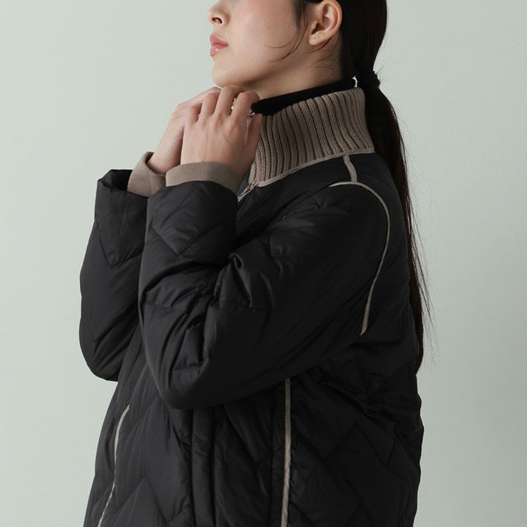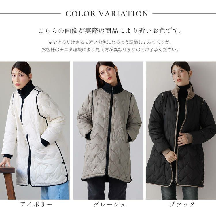 ※キーワード:≪Filomo / フィローモ≫ ブラック グレージュ アイボリー バイカラー ミディアム 膝丈 軽い 上着 暖か シンプル オーバーサイズ 体系カバー Aライン 普段使い メンズライク アウター ダウン コート ジャケット リブ 20代 30代 40代 キルティング 動きやすい 自転車 異素材 切り替え コンビ ドッキング ミックス 白 黒 2023 新作
