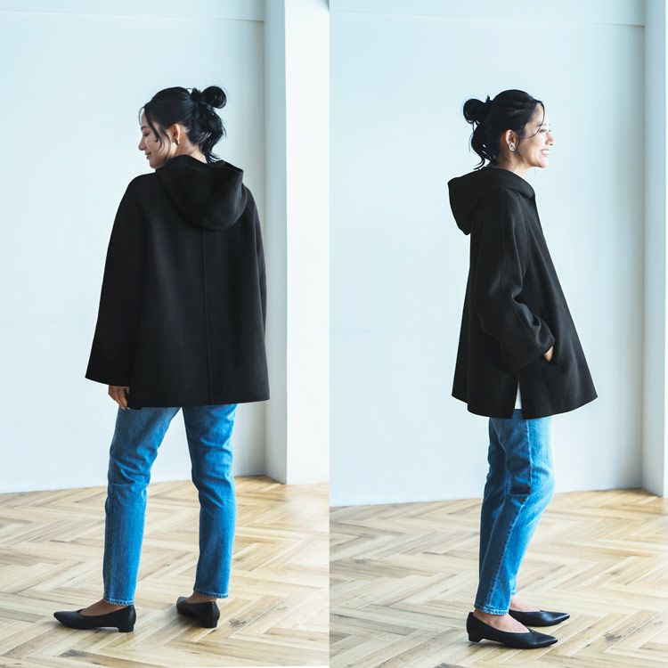 filomo ウール カシミヤ 一枚仕立て フード付き コート アウター ミドル丈 黒 フォーマル ブラック シンプル ゆったり