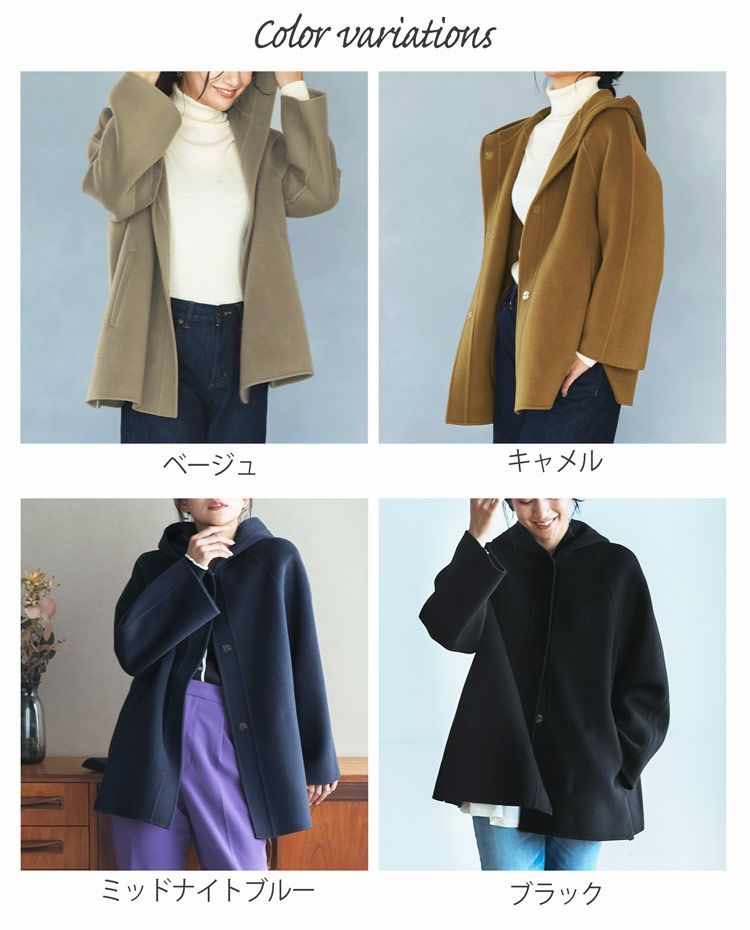 ※キーワード: filomo ウール カシミヤ コート アウター フレア ミドル丈 ミドルコート ベージュ キャメル ミッドナイトブルー ネイビー ブラック 黒 シンプル 着回し ポケット フード ゆったり 大きいサイズ 大きめ 女性 レディース 大人 かわいい シルエット 一枚仕立て フード付き カラー 4色 ゆったり