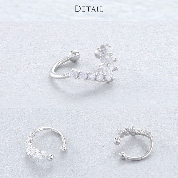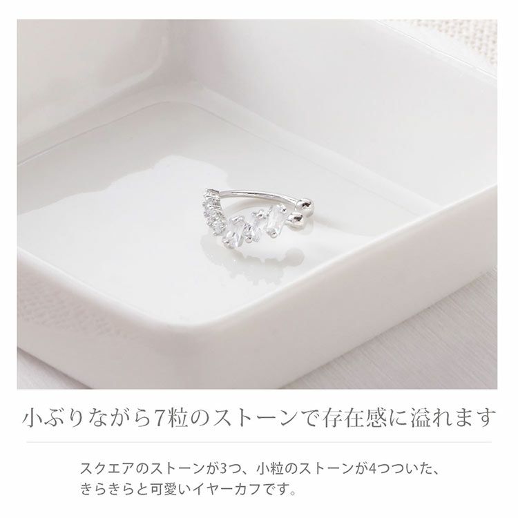 スクエアのストーンが3つ、小粒のストーンが4つついた、きらきらと可愛いイヤーカフです。
