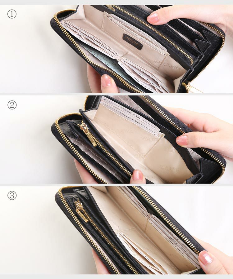 ラウンドファスナー型の財布で開口部が大きく開いたり、カード収納が20枚可能、l字に開く小銭入れなど、