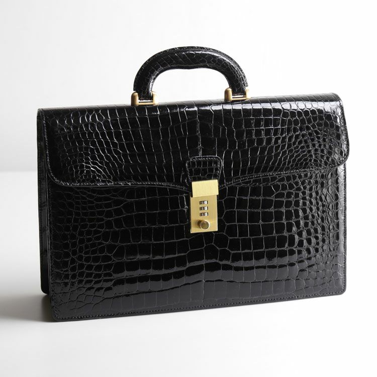 ナイルクロコダイルの腹部の革をセンター取りで使用したメンズビジネスバッグ。