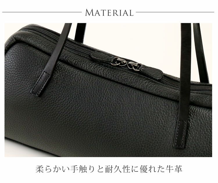 本体には柔らかな質感を持った牛革を使用。使い込むほどに味わい深く変化していきます。ハンドル部分は滑らかな触り心地のヌメ革を使用しており、長時間持っていても疲れにくくなっています。耐久性に優れているため、長い間愛用して頂けるフォーマルバッグです。