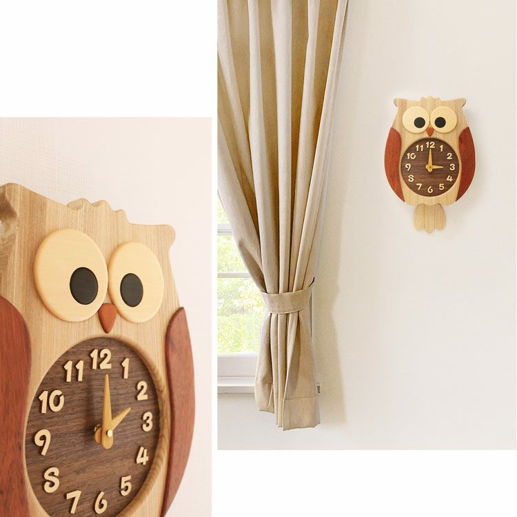 天然木で作ったフクロウの壁かけ時計。 シンプルに仕上げた文字盤はとても見やすく、 プラスチック板が貼られていないため、 照明などの光の反射で見づらいこともありません。 幸運の象徴として 世界中から親しまれているフクロウ。 日本でも『不苦労』『福朗』『福老』と、 その名前から縁起物とされてきました。 そんなフクロウを可愛らしく表現した壁掛け時計は、 お部屋の雰囲気を明るくし、癒しをあたえてくれます。 こちらの壁かけ時計は、 北海道旭川の工房で作られています。 樹種によって木目も手触りも異なる 多様な味わいをそのままに、 毎日を彩る品々を手作業で細部まで 職人が丁寧に仕上げています。 木が本来持っている色や木目の個性を活かし、 製品はすべて無着色。 それぞれの素材の良さを損なうことのないよう、仕上げはオイルで丁寧に塗装しました。 フクロウの尾翼の部分が振り子になっており、 ゆらゆらと可愛らしく動く姿に癒されます。 家庭だけでなく、病院、保育施設、店舗など、 様々なシーンに活用できる 高いデザインの完成度も魅力です。 動力は乾電池1本で、時計そのものに 加え振り子の動きまで一貫しているため、 面倒なメンテナンスは一切ありません。
