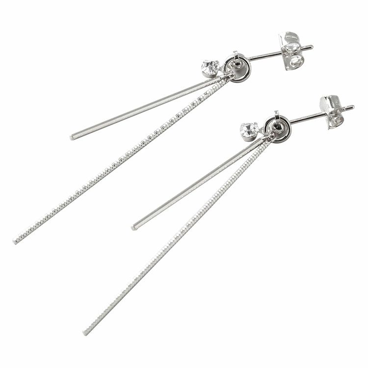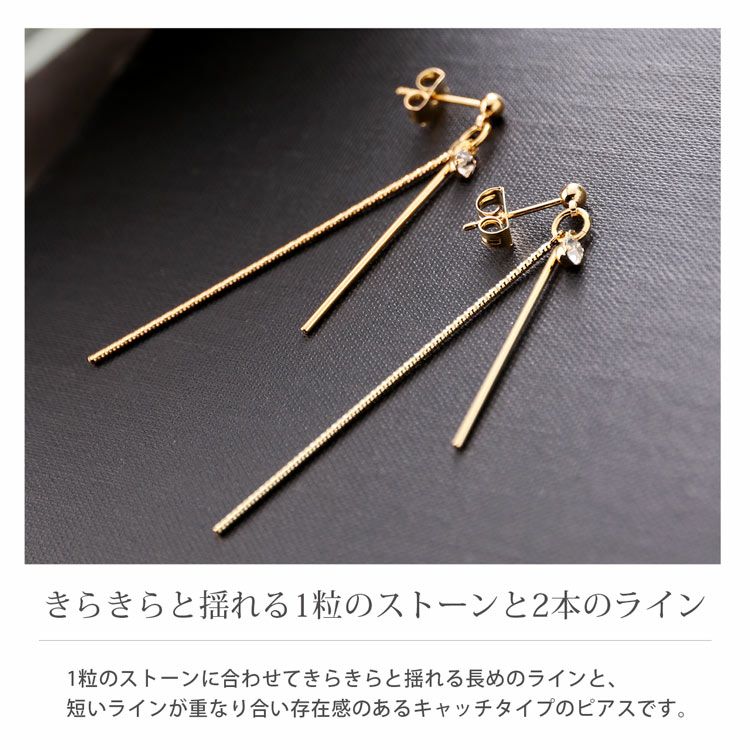 1粒のストーンに合わせてきらきらと揺れる長めのラインと、短いラインが重なり合い存在感のあるキャッチタイプのピアスです。