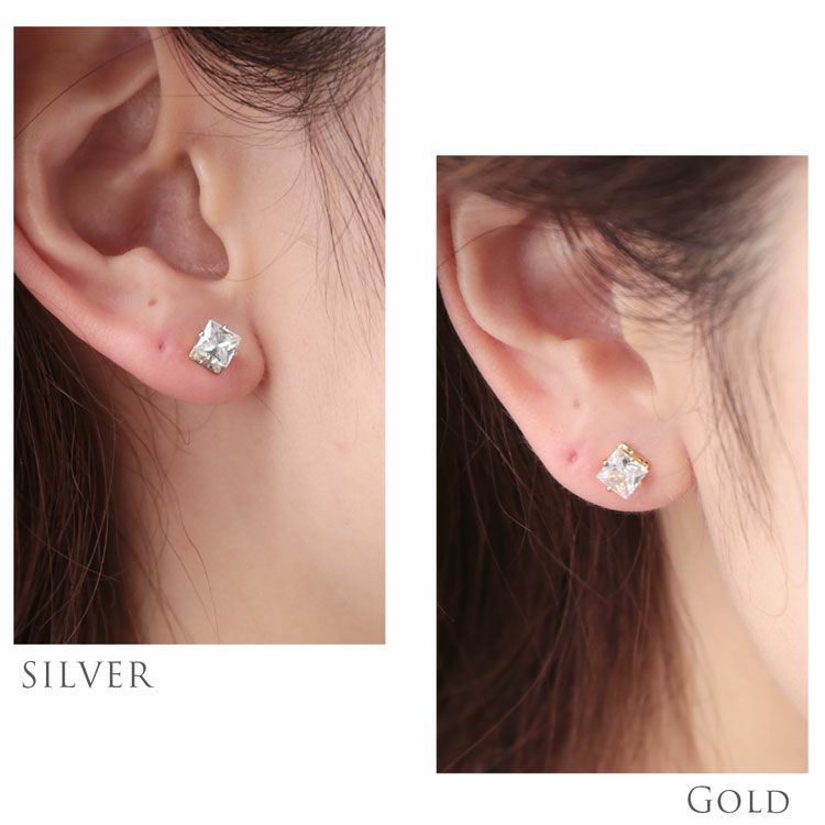 王道スクエア型1粒ストーンをあしらったキャッチタイプのピアスです。5mで存在感があり、お顔周りを耳元から華やかにしてくれます。