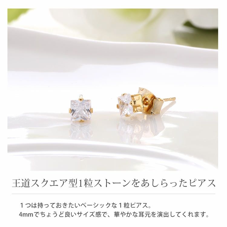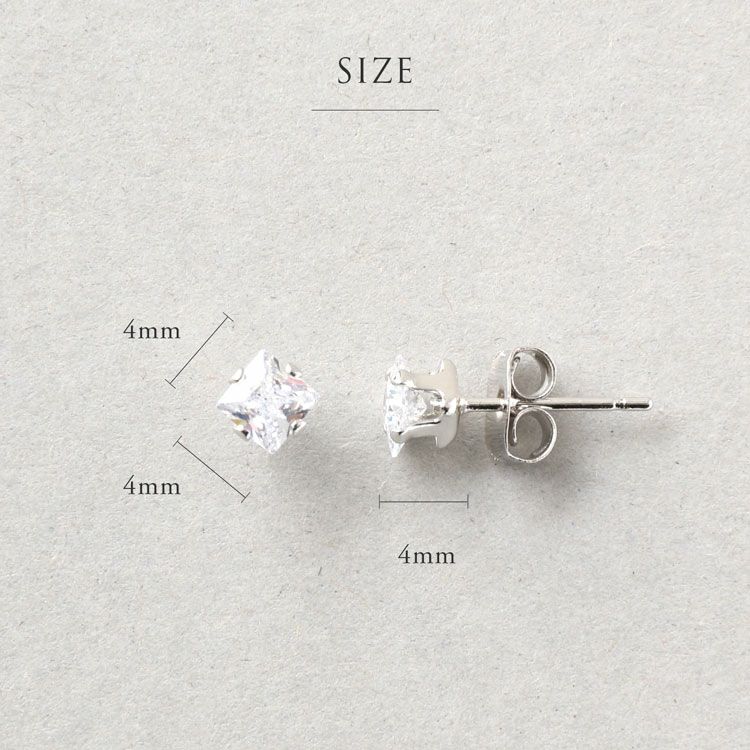 王道スクエア型1粒ストーンをあしらったキャッチタイプのピアスです。4mmでちょうど良いサイズ感で、華やかな耳元を演出してくれます。