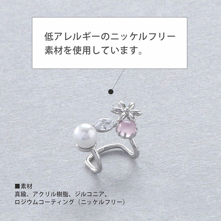 パール、フラワーモチーフ、まるいピンクのストーン、リーフのストーン、たくさんの可愛いが並んだイヤーカフ。
