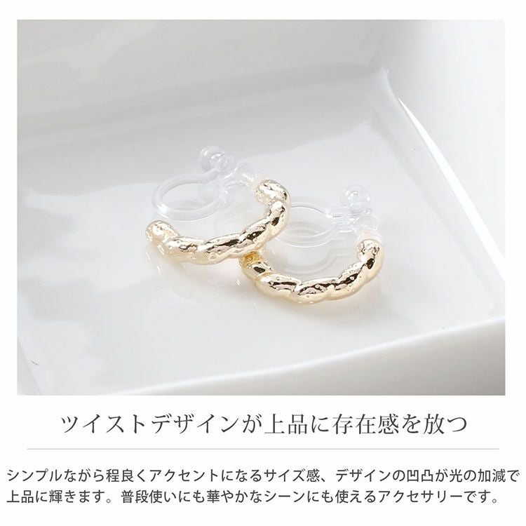 シングルラインのツイストデザインが上品に存在感を放つ、フープ風イヤリング。