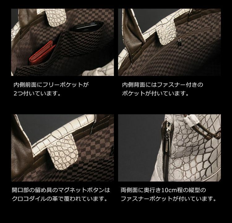 | 素材 | 表側:クロコダイル 内装:生地、牛革(本革) (革紐やハンドルの裏側、ショルダーベルトに牛革を使用しています) |