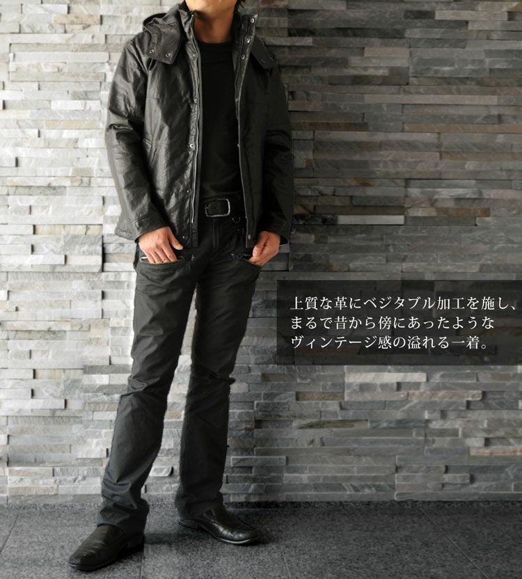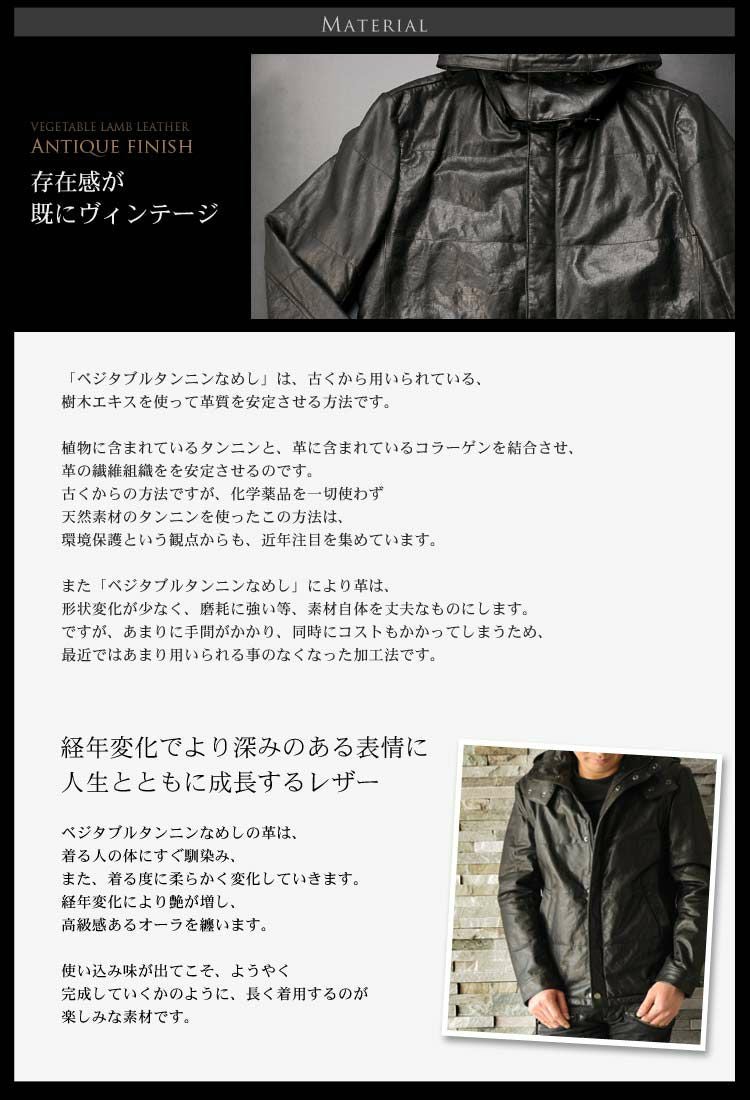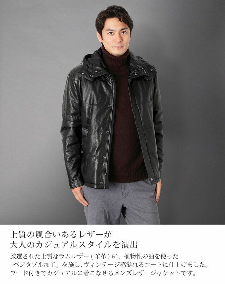 ラム レザー メンズ ジャケット ベジタブル加工 フード付き ブラック M/L/LL/3L 7F