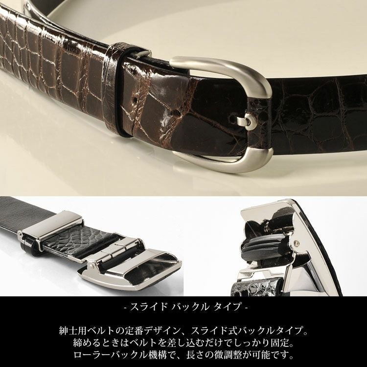 天然皮革 エキゾチックレザー クロコダイル 35mm シャイニング加工 ベルト メンズ 本革 ワニ革 ベルト スライドバックル ピンバックル スライドバー シャイニング加工 ローラーバックル シルバー金具 誕生日 プレゼント ギフト