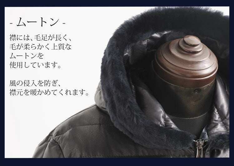 レザー&ダウンで防寒性も抜群、ムートンを襟元に使用したデザイン性も高い逸品。