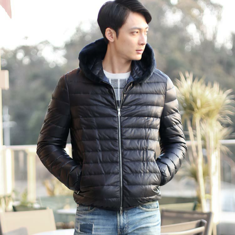 5. OLIVIERI/オリヴィエリ ラムレザー メンズ ダウンジャケット ムートントリム フード付き 7F