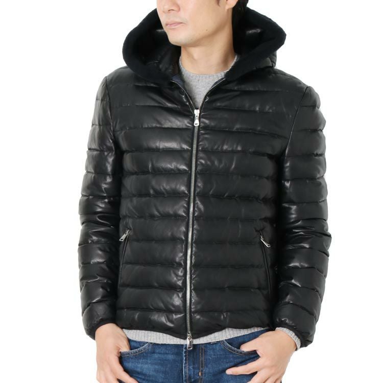 OLIVIERI/オリヴィエリ ラムレザー メンズ ダウンジャケット ムートントリム フード付き 7F