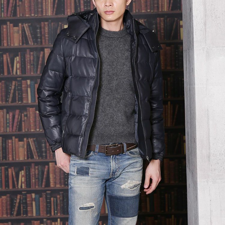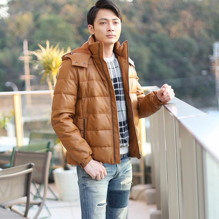 風を通さないレザーダウンジャケットは、カジュアルシーンはもちろん通勤や、