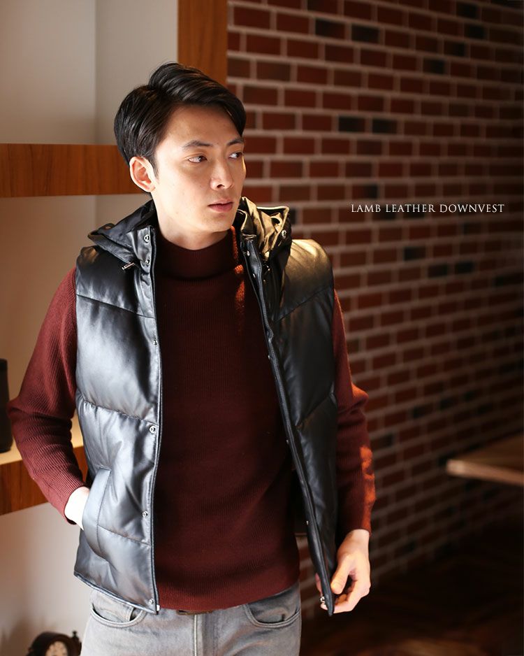 ラム レザー ダウン ベスト メンズ フード付き 秋/冬 全3色 7F
