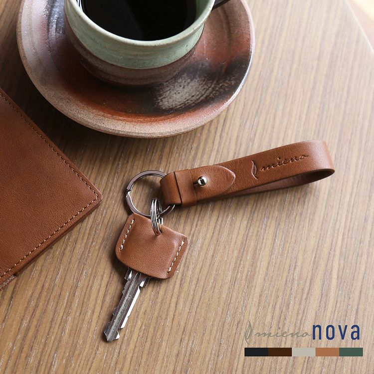 手軽に使える革製品を提案するmienoから、 素材にこだわる大人のための新シリーズ登場。 使っていく人のセンスを格上げしてくれる nova(ノヴァ)レザーキーホルダーをお楽しみください。 鍵を保護するキーカバーが付いた本革キーホルダー。 大きめのストラップで紛失防止にも役立ちます。 毎日使う鍵をおしゃれに持ち運べるアイテムです。 ストラップでバッグに付けて持ち歩くこともできます。 -鍵の付け方- 1.リングからカバーを取り外します。 2.鍵にカバーをつけます。 3.鍵とカバーの穴を合わせ、リングに通します。 4.取り付け完了 くたっとした柔らかな質感が特徴のノヴァレザー。 ナチュラルテイストな風合いで上品な印象。 長く愛用したくなる味わいのある革。