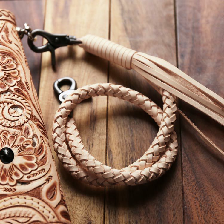 ヌメ革を編み込んだロープにフリンジが付いたウォレットロープ。