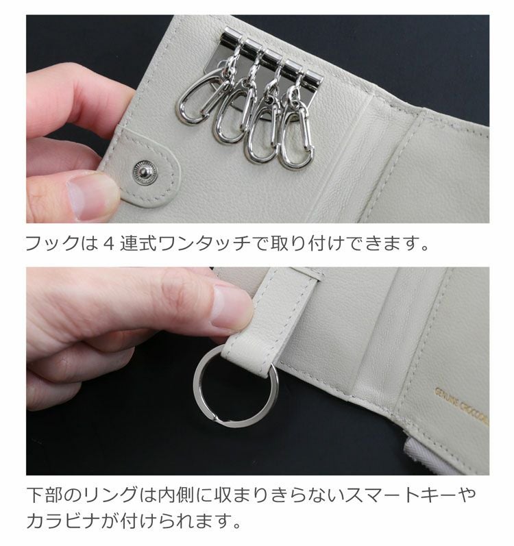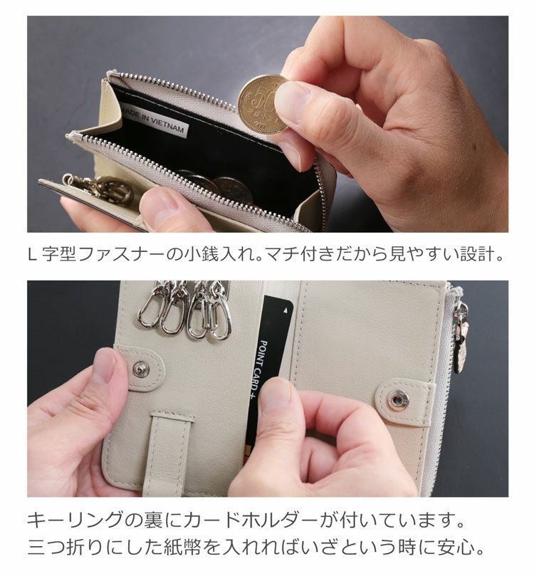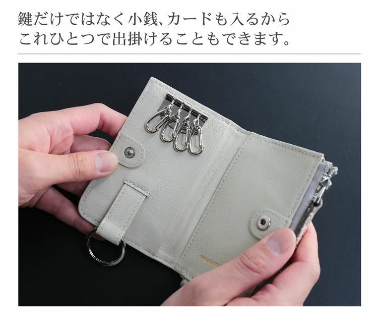 機能面も充実、小銭入れやカードケース、大き目キーリングにスマートキーを付けることもできます。