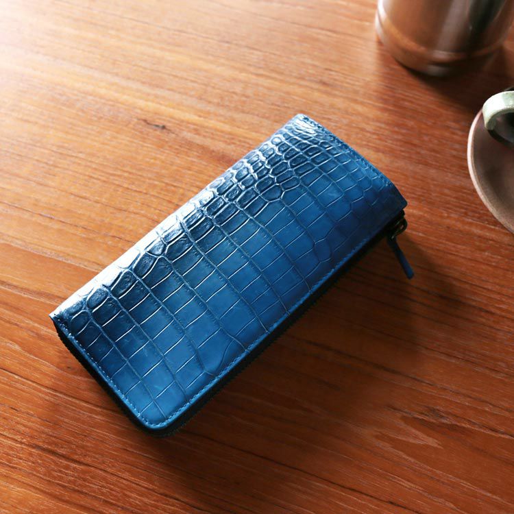 「やっぱりお札は折りたくない」方にオススメできる、 きれいにお札が入るL字ファスナー長財布です。 稀少性が極めて高い高級素材であることから、 『皮革の宝石』と称される ナイルクロコダイルを使用しています。 革の表面には日本のタンナーにより、 丁寧にグラデーション染めを施されています。 鮮やかな色合いから徐々に 深みのあるダークトーンへ色が移り変わる、 美しい色調を堪能できます。 お札入れは3つに分かれており、 お札やレシートの仕分けができる仕切り付き。 領収書やポイントカードなど整理がきっちりできます。 通帳やパスポートなどもしっかり入る、 充実の収納力を持ったL字ファスナー財布です。 内側の一番の特徴は片方のみマチがない 仕切り付きの紙幣入れです。 サッと取り出し、収納できるので 会計をスムーズに行えます。 スリムなL字ファスナー長財布で ここまで大きく開くのは珍しく、 使い勝手の良いお財布に仕上がっています。 また内側は牛革(本革)を使い、 耐久性と高級感を兼ね備えた長財布です。 カード収納14枚でポイントカードなどが多い人にもオススメできます。 クロコダイルに似合う、艶を抑えたアンティーク調のファスナーと金具を使用しています。