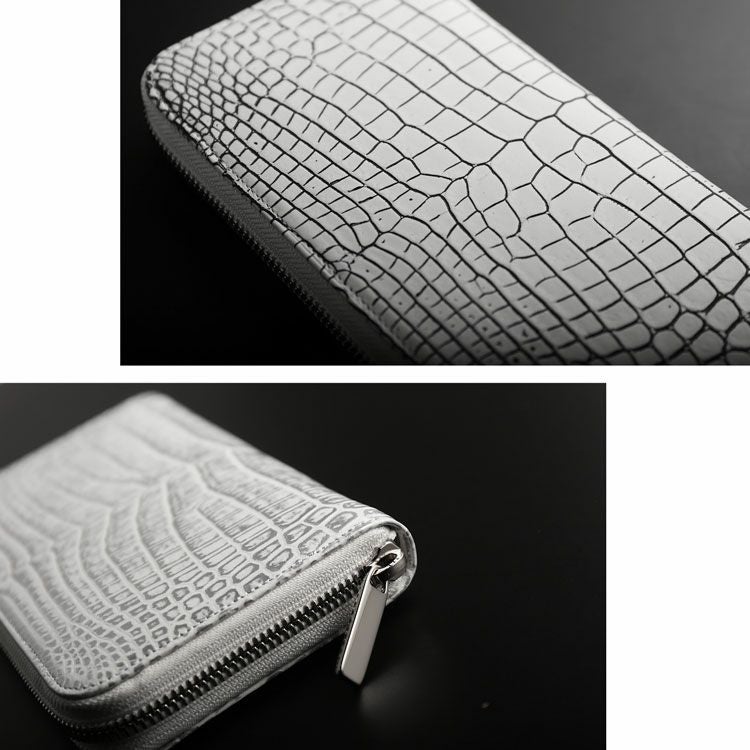 商品名:クロコダイル 長財布 メンズ センター取り 一枚革 ラウンドファスナー 日本製 変わり染め JRA メタルファスナー メタリック ブラック ブルー ボルドー ホワイト シルバー