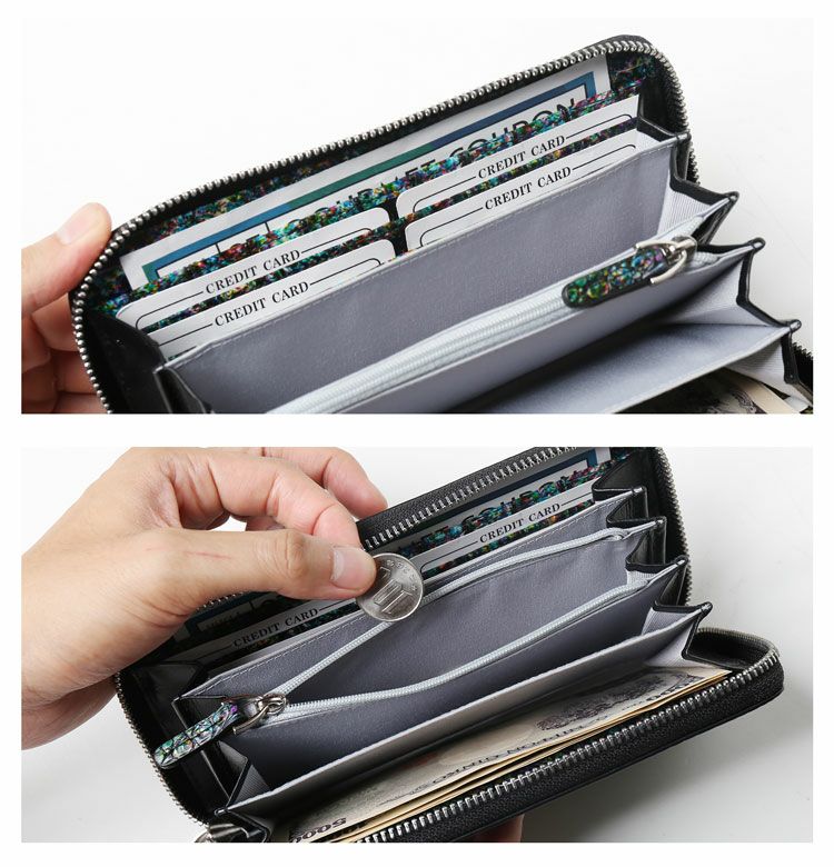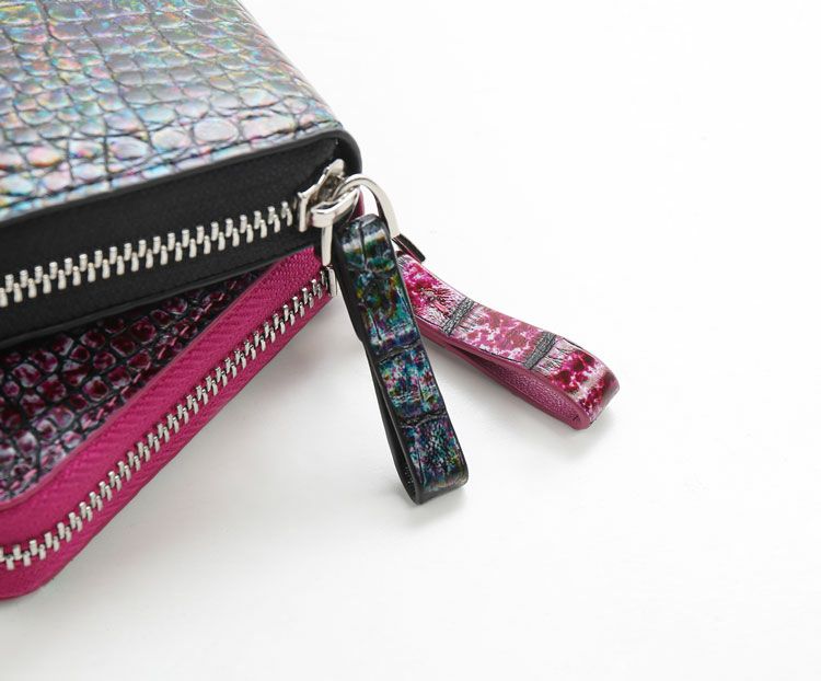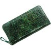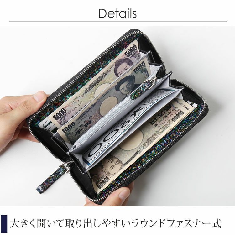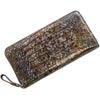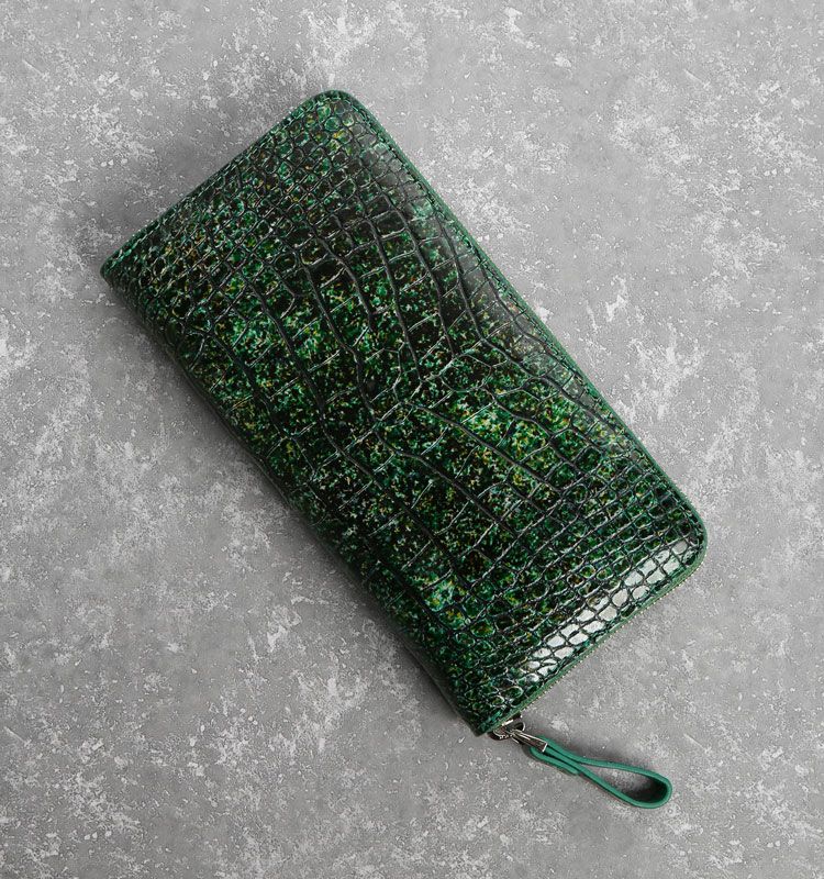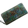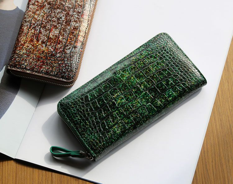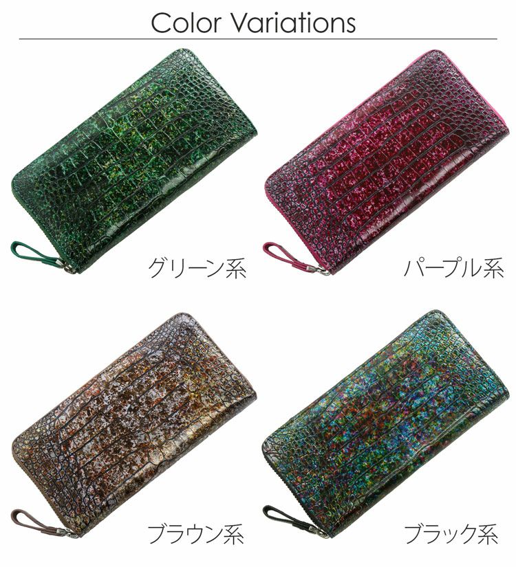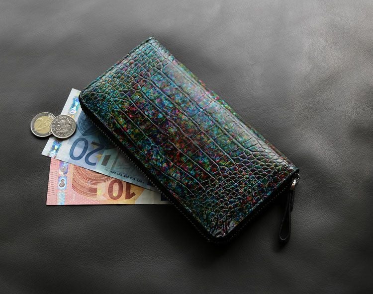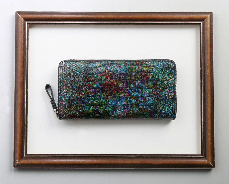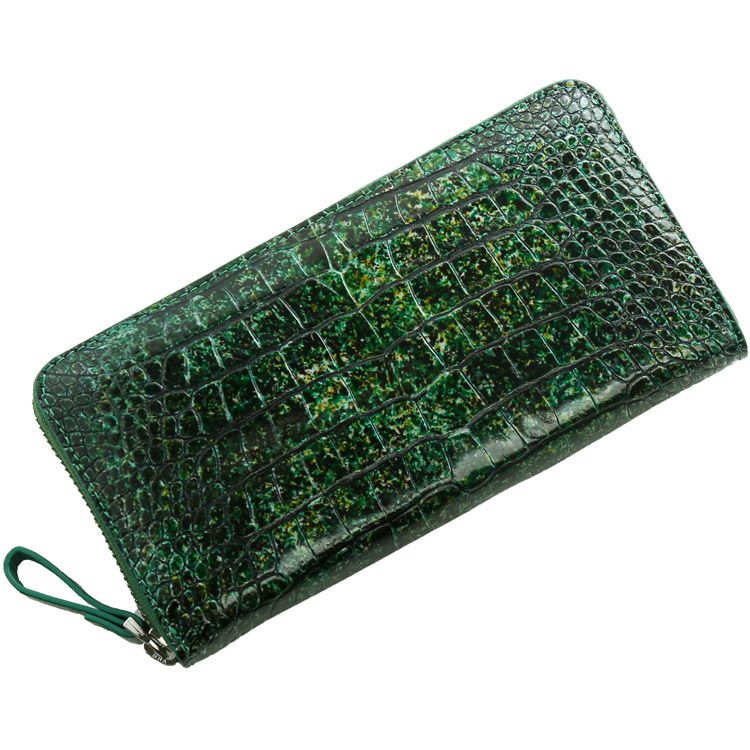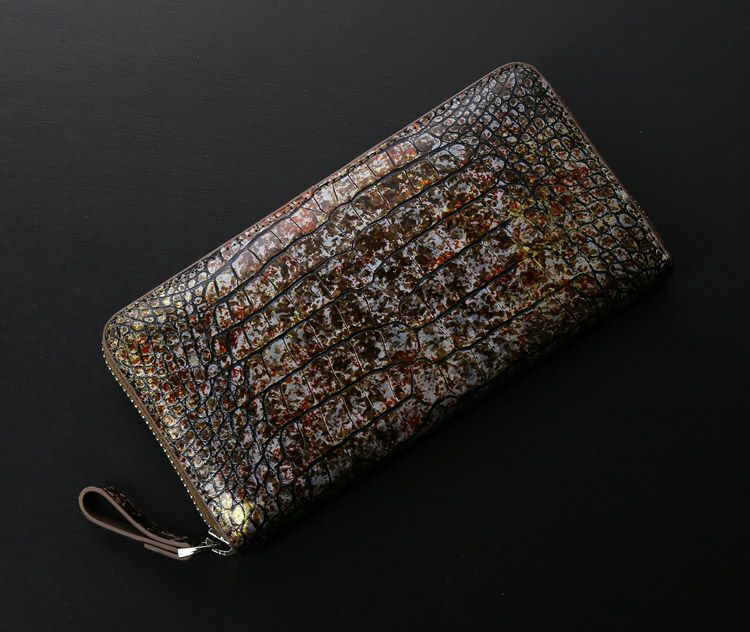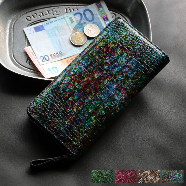 まるでアート作品かのような美しい模様のクロコダイル長財布。 皮革の宝石と称されるクロコダイルの美しい腑模様と フランスクロコ社の特殊な手染めの模様が絶妙にマッチした長財布。 1枚づつすべて手作業で色ごとに別のスポンジを使って、 押して色を出したり、ブラシで描いたりと、 まるで1つのアート作品を仕上げるかのような工程で染色を施した、 非常に手間暇かけたクロコダイル革になります。 職人が1つ1つ手作業で染色しているので、 同じカラーでもそれぞれ風合いが異なり 世界で1つだけの財布に仕上がっています。 ファスナーチャームもアートのように美しいデザインが施されています。 開口部はラウンドファスナーで『コの字』型に大きく開きます。 内装は4つの紙幣入れと片マチファスナーの小銭入れで構成されています。 内側の前面と背面にカードホルダー×4とワイドポケット×1がそれぞれ付いています。 中央の小銭入れは片マチで大きく開き、小銭が取り出しやすい工夫が施されています。