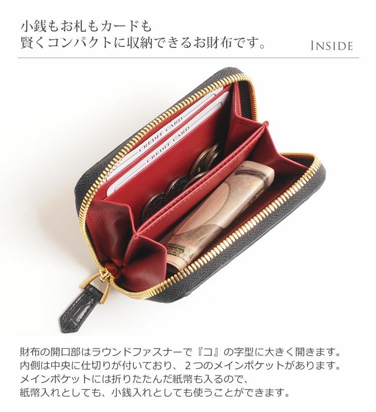 ラウンドファスナー式で大きく開き、お札や小銭が取り出しやすい造りです。