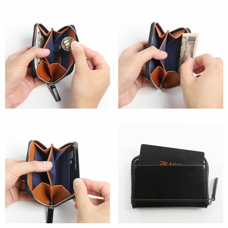 ラウンドファスナーで開閉し、折り畳んだ紙幣、小銭入れ、カードが入るミニ財布。