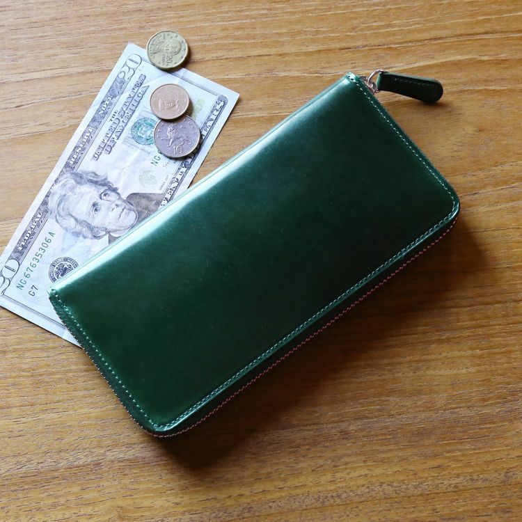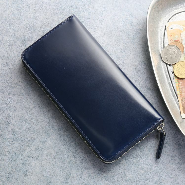 無駄な装飾の無いシンプルなデザインで、コードバンの素材感が生きた長財布です。