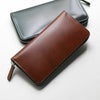 ラウンドファスナーでコの字型に大きく開くファスナー長財布です。