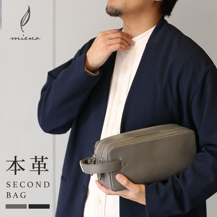 とても滑らかで柔らかい牛革『スピラレザー』を使用しています。 しっとりと手に吸い付き馴染むようなソフトな肌触りと 本革ならではの味のある光沢感が魅力です。 必要な物をコンパクトに収納出来るセカンドバッグ。 長財布はもちろん、B6サイズ(128×182)の本や手帳が入る大きさで使い勝手抜群。 更に2つの収納スペース内にそれぞれ内ポケットも備わっており、 アイテムを整理して持ち運ぶことができます。 前面側の収納スペース内にファスナー付きポケット×1 背面側の収納スペース内にファスナー付きポケット×1、フリーポケット×2 ハンドルは1.5cmずつの3段階で長さ調節ができます。 背面側の収納スペース内に『mieno』のブランドロゴを刻印。 シンプルなデザインでビジネスからカジュアルまで幅広くお使い頂けます。 革の表面の自然な光沢感がさりげない高級感をプラスします。