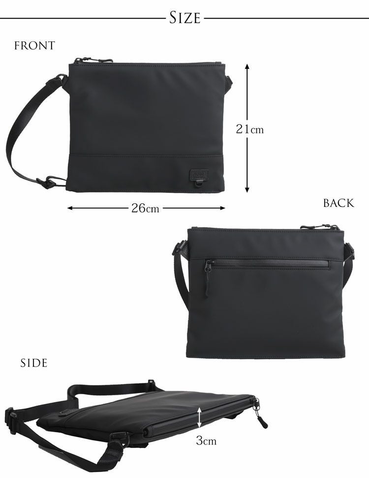 落ち着いたシンプルなデザインであらゆるコーディネイトに合わせられる万能なサコッシュ。