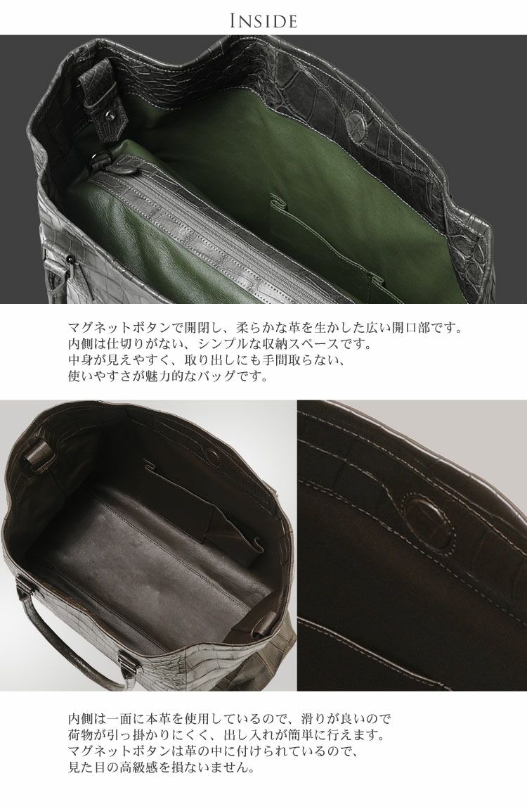 一般的なビジネスシーンでよく使う資料などのサイズがA4サイズ。そのA4サイズが収納できる、クロコダイル(ワニ革)を使ったメンズバッグをご案内しています。シンプルだけど高級感がある、本物志向の男性におすすめのバッグです。シンプルだからビジネスシーンだけでなく、カジュアルなシーンにもお使いいただけるバッグが多数となります。