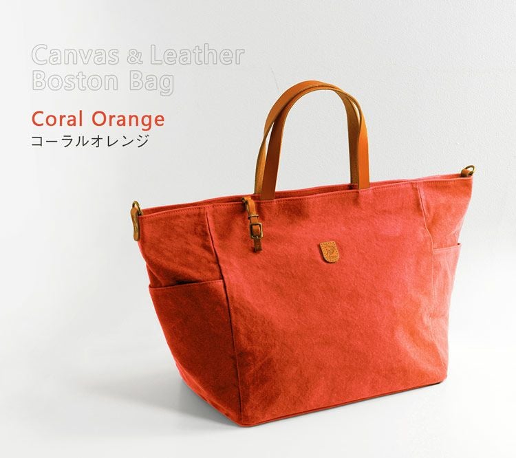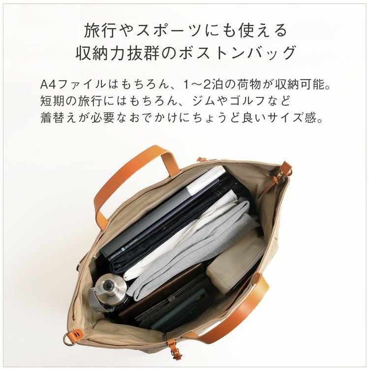 帆布とヌメ革を組み合わせた大容量のボストンバッグ。